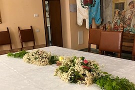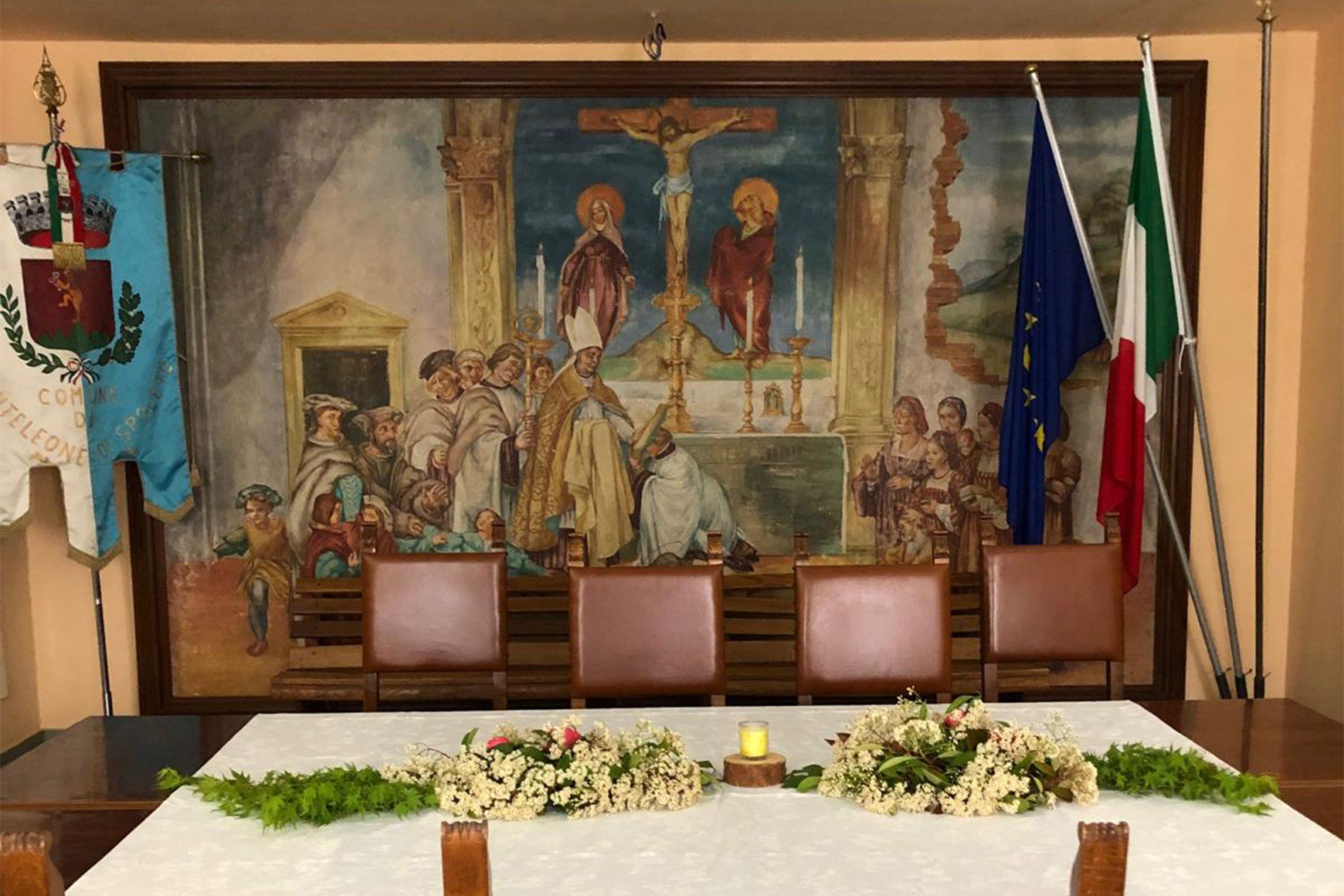 Le pareti, decorate con delicati frammenti ottocenteschi a tempera riportati alla luce dai restauri, dialogano con la maestosa tela della seconda metà del XX secolo che domina la parete di fondo: una scena sacra di ispirazione rinascimentale, dono della famiglia Alfonsi, che avvolge l’unione in un’aura di nobiltà e calore artistico.