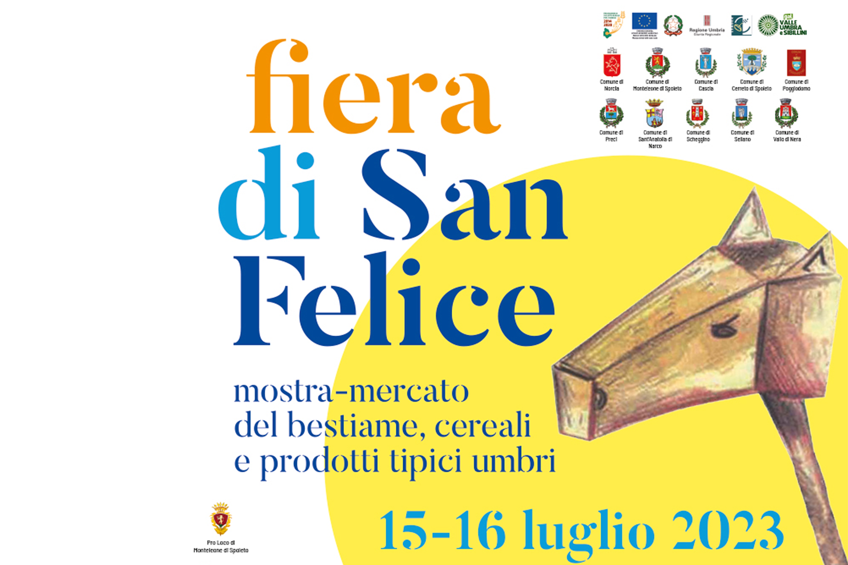 Per domenica 16 luglio altre iniziative all’insegna della scoperta, della cultura e del divertimento che accompagneranno la Mostra Mercato: alle ore 8.15 partenza per il percorso di trekking con guide esperte che racconteranno le caratteristiche storiche, naturalistiche, geologiche, e molte curiosità sul territorio di Monteleone con il MuST-Museo delle Scienze e del Territorio e con Intgeomod srl, (per info e prenotazioni chiamare 331.1305612).Presso la località delle Vallatte, alle ore 10.30 meeting di presentazione dei soggetti CAITPR del territorio con un incontro divulgativo sul “CAVALLO AGRICOLO ITALIANO DA TIRO PESANTE RAPIDO”, per la valorizzazione degli allevamenti selezionati del borgo di Monteleone di Spoleto, a cura dell’Associazione allevatori Umbria e Marche e dell’Associazione nazionale allevatori Cavallo Agricolo Italiano da TPR. La serata si concluderà alle ore 20.30 in Piazza Margherita con l’Estrazione della Lotteria di San Felice e la consegna del Premio a Tutti i “Felici d’Italia”, in seguito concerto degli ALTAQUOTA e laboratorio di danze popolari “Saltarello e Quadriglia” a cura di Sabina Gala e dell’Associazione Taranta. Si ringraziano tutte le associazioni del territorio per la preziosa disponibilità e supporto, dati per l'organizzazione dell'evento.
